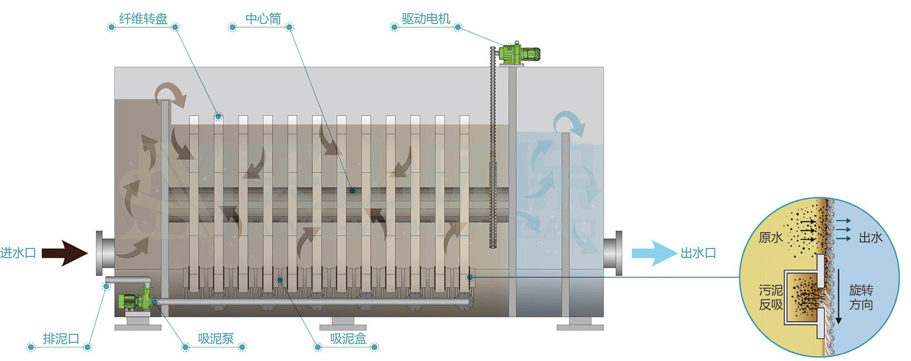 過濾:周進(jìn)中出,污水隨重力流進(jìn)入濾池,使濾盤全部浸沒,污水通過濾布過濾,過濾液通過中空管收集后,重力流通過出水堰排出濾池。